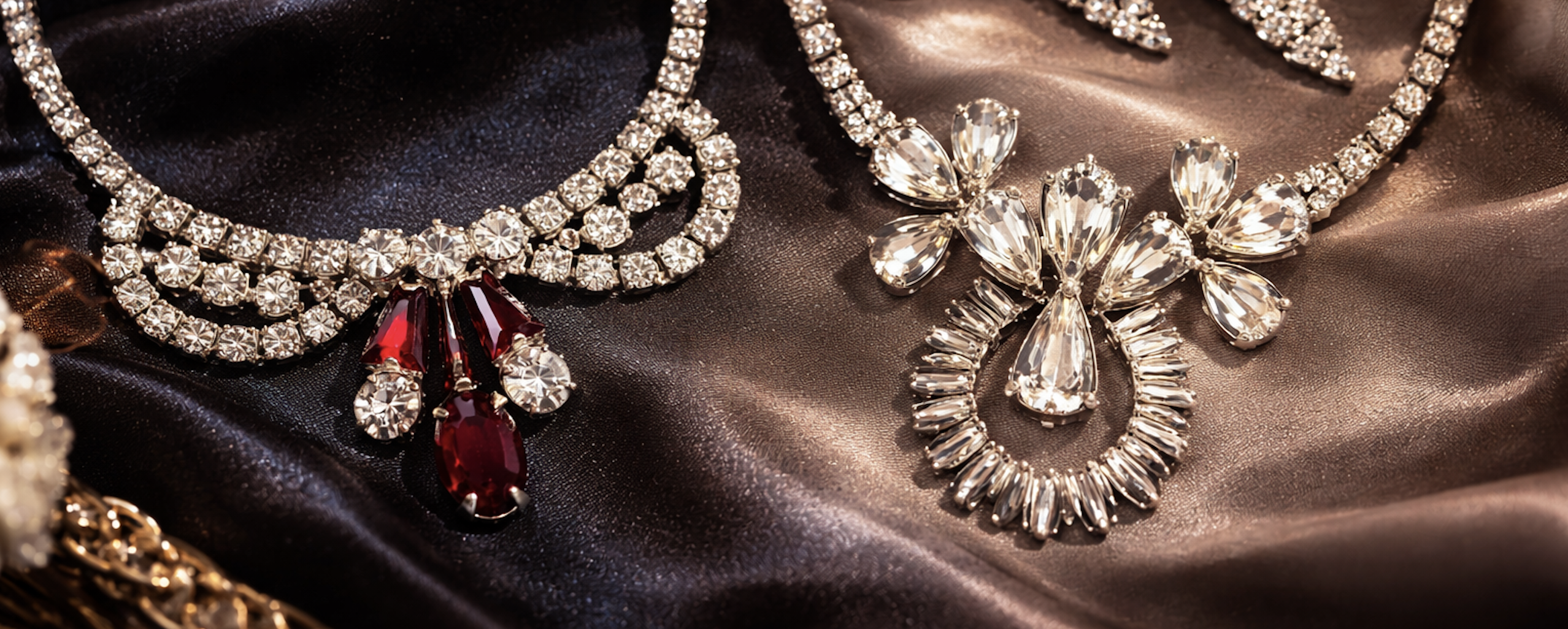 Signed Sherman necklace featuring bright clear rhinestones and deep red accent stones in a graceful draped bib design. A striking mid-century statement piece with strong visual contrast and classic collector appeal, created in an early minimalistic style.