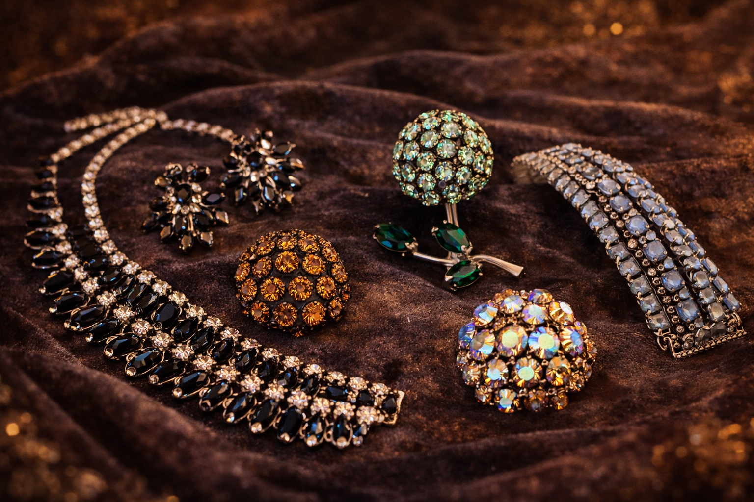 Collectors often associate Warner with dramatic palette choices, prong-set construction, and signature finishes such as dark japanned metal paired with bright stones. The brand is particularly appreciated by buyers who want bold 1950s-1960s glamour with clearly signed pieces and dependable visual impact, especially in brooches, earrings, bracelets, and coordinated sets.