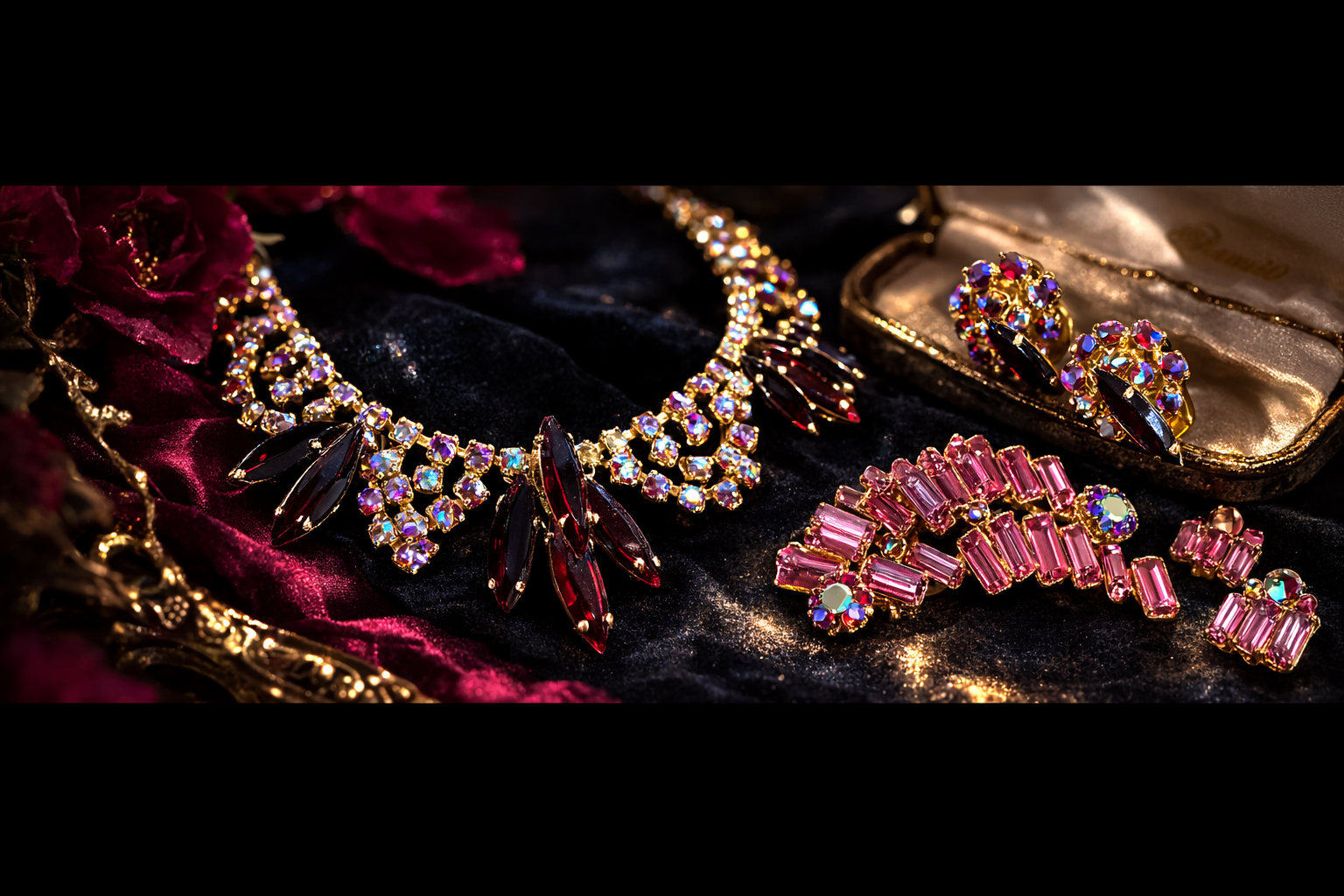 Signature Sherman pieces are often associated with precise stone alignment, dimensional construction, and dramatic evening sparkle. Signed examples marked "Sherman" remain especially sought after by vintage buyers who want bold mid-century glamour with dependable craftsmanship and wearability. The line is especially admired for statement necklaces, coordinated sets, and high-contrast crystal palettes that photograph beautifully while still reading refined in person.
