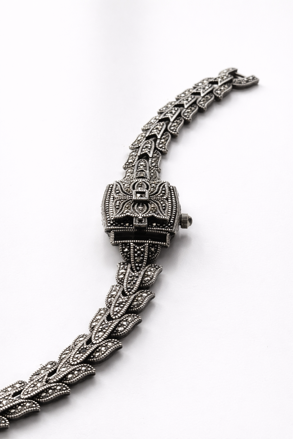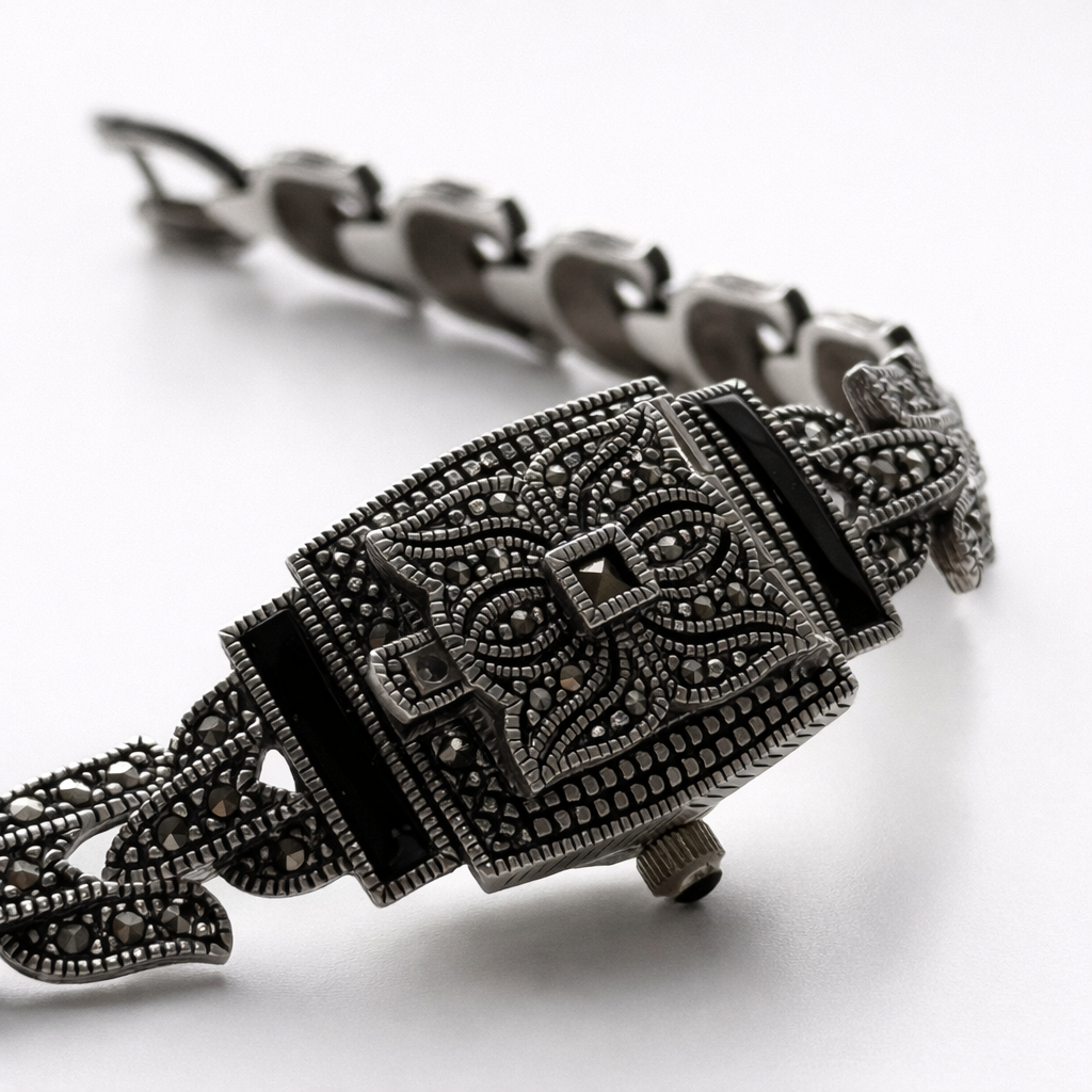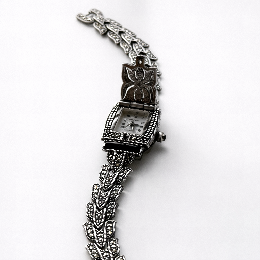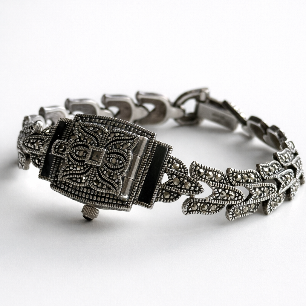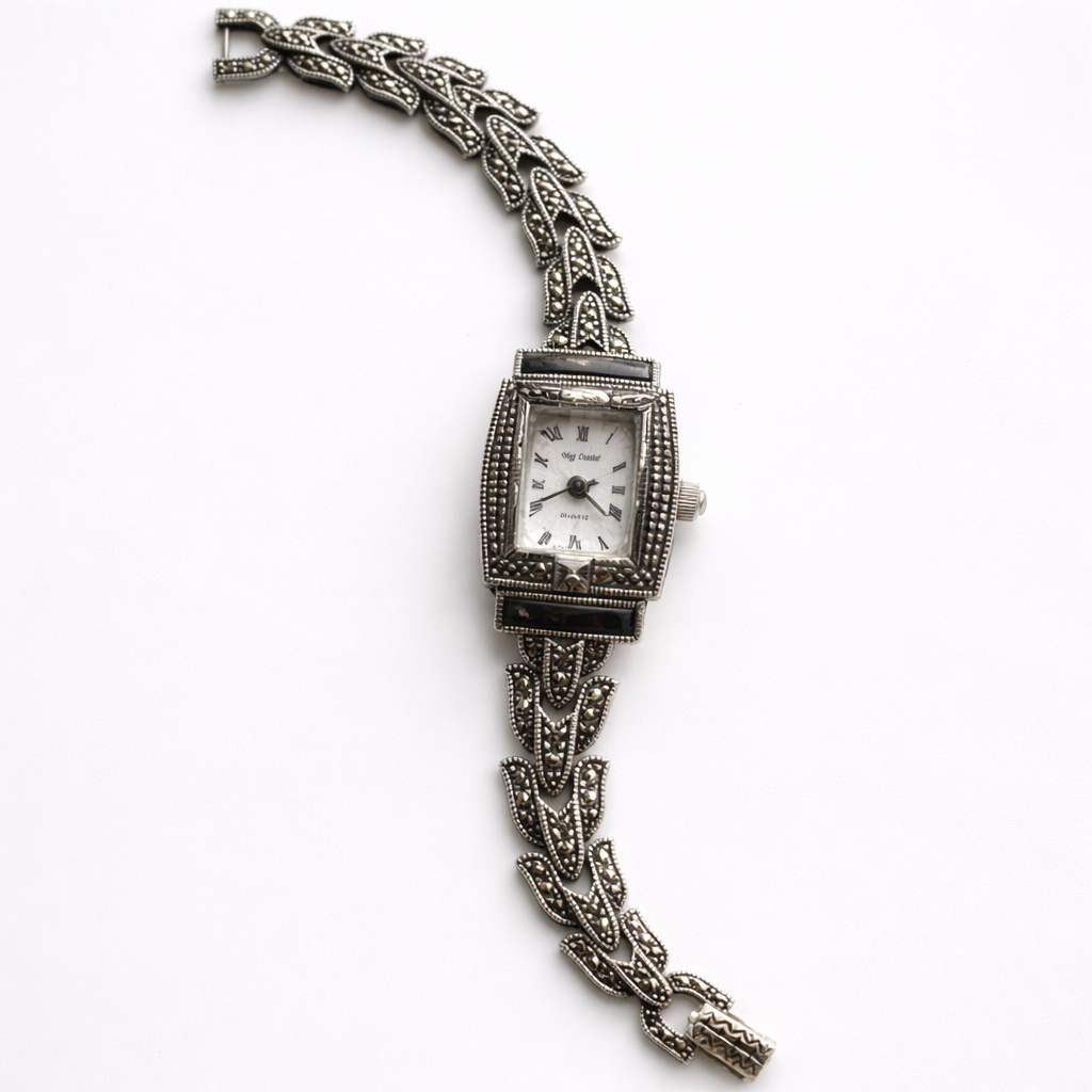 Sterling silver bracelet watch with an ornate marcasite leaf link design, black accents, and a hinged cover revealing a petite Roman numeral dial. Decorative, elegant, and distinctly Art Deco inspired.