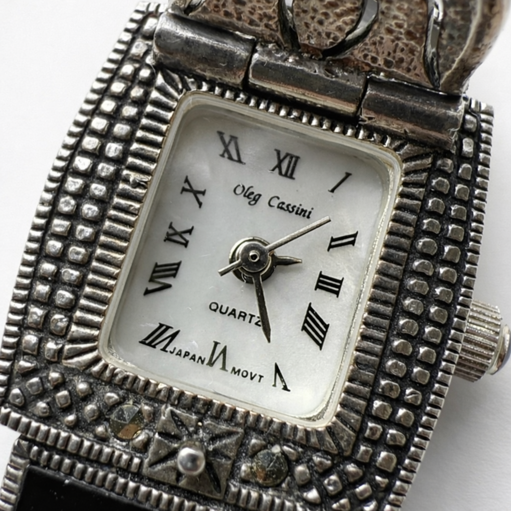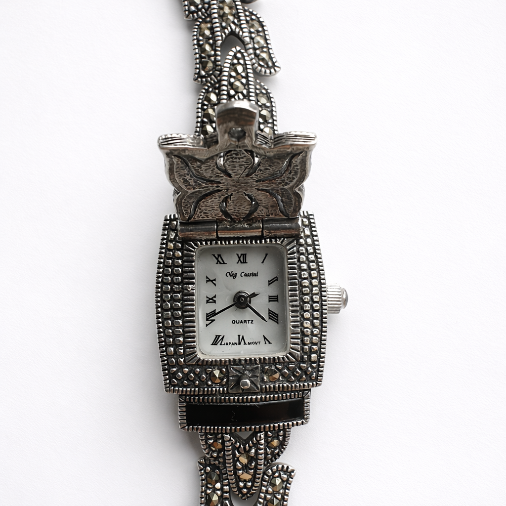 Signed Oleg Cassini watch with Sterling Silver and Marcasite. A refined one-of-one vintage find with Bracelet watch styling, best suited for gift wear.