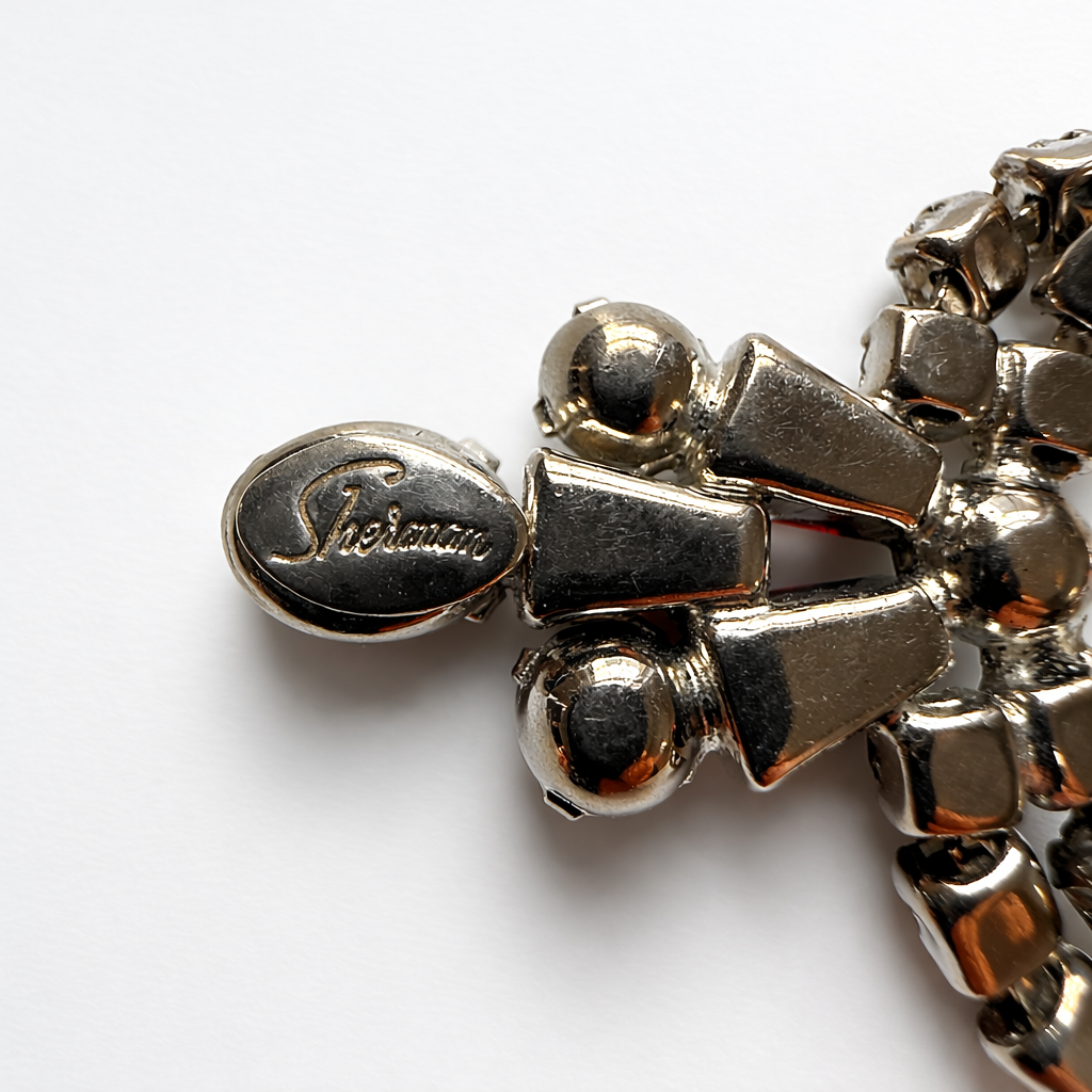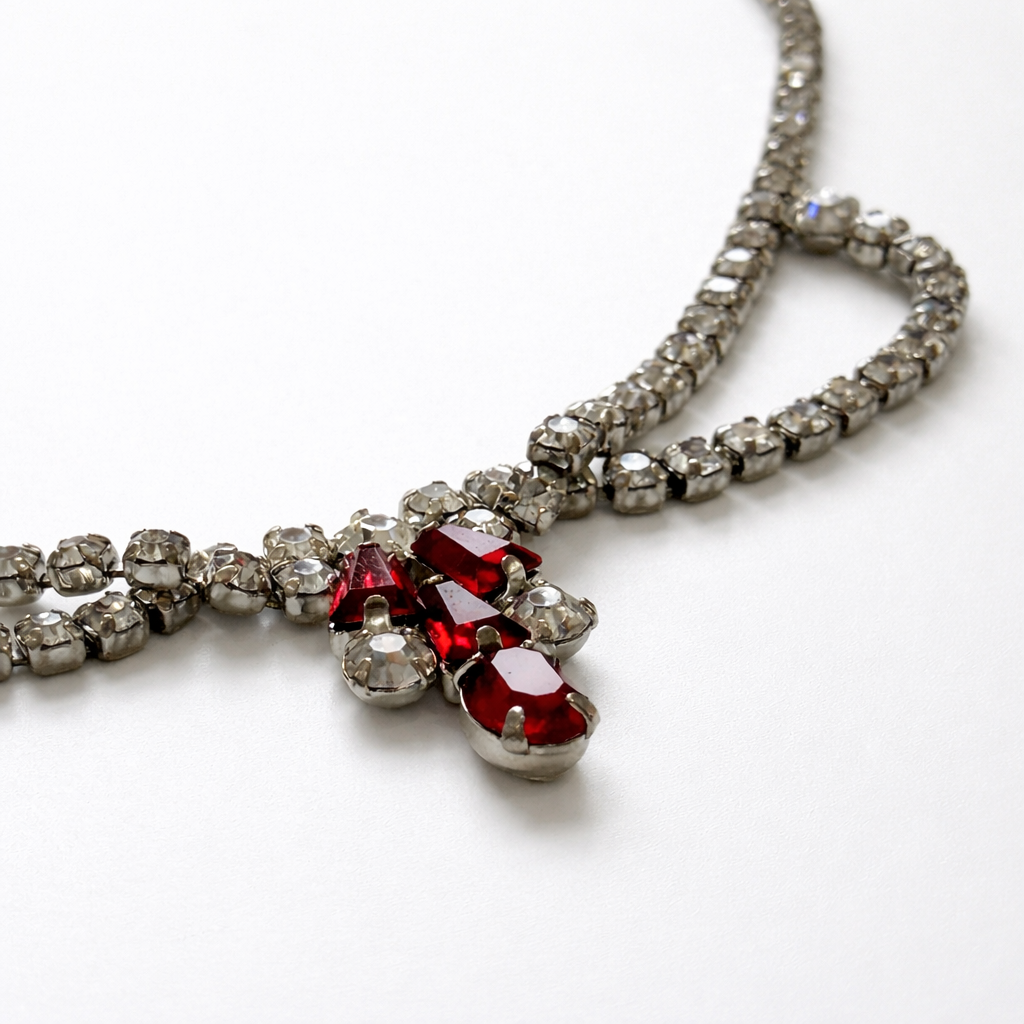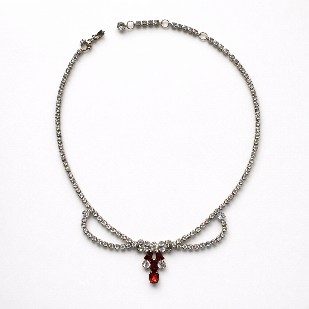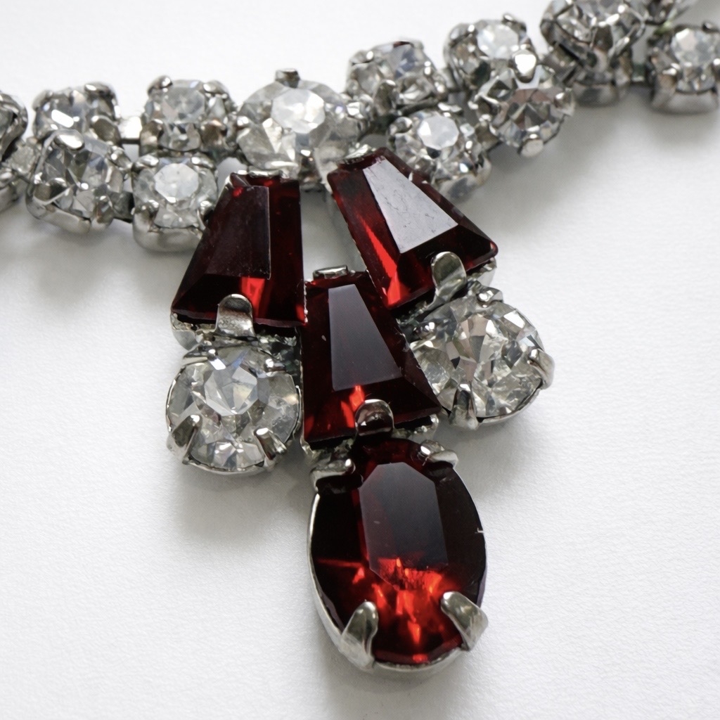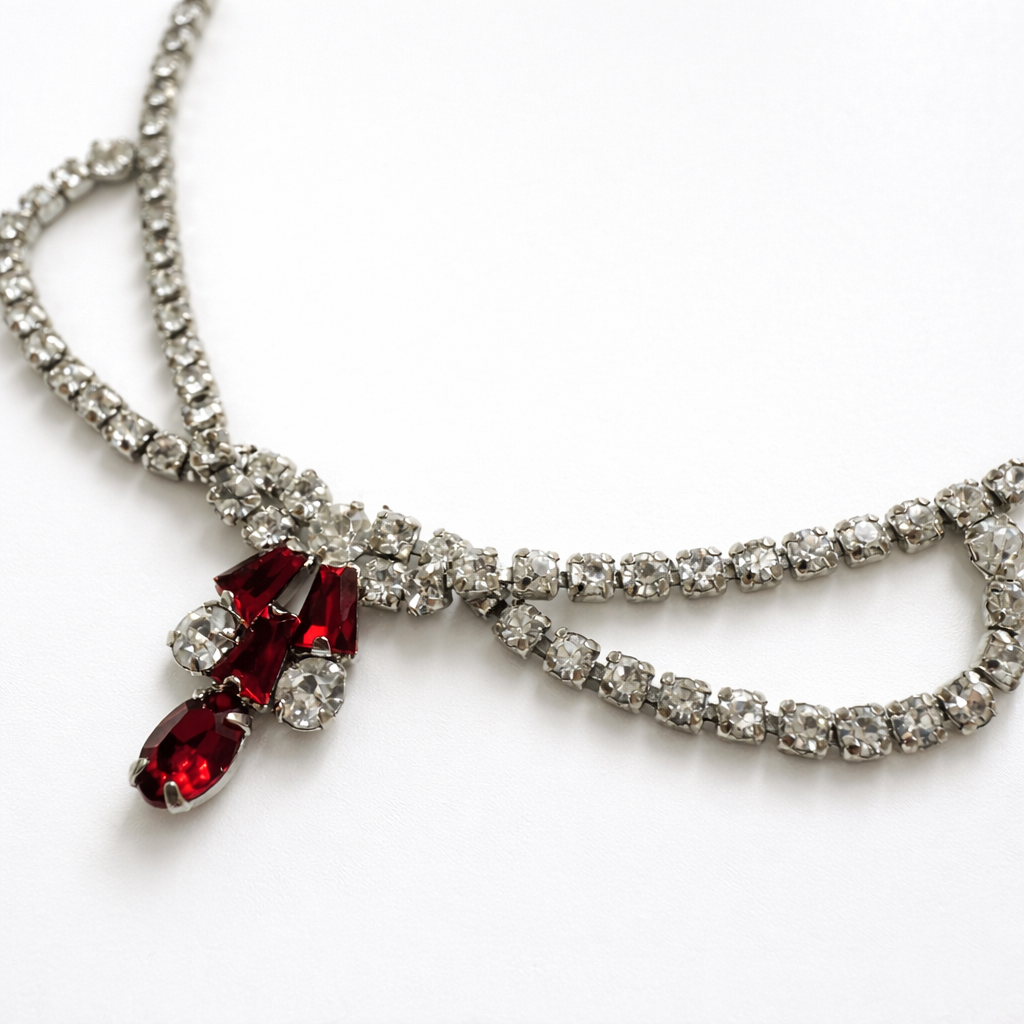 Signed Sherman necklace featuring bright clear rhinestones and deep red accent stones in a graceful draped bib design. A striking mid-century statement piece with strong visual contrast and classic collector appeal, created in an early minimalistic style.