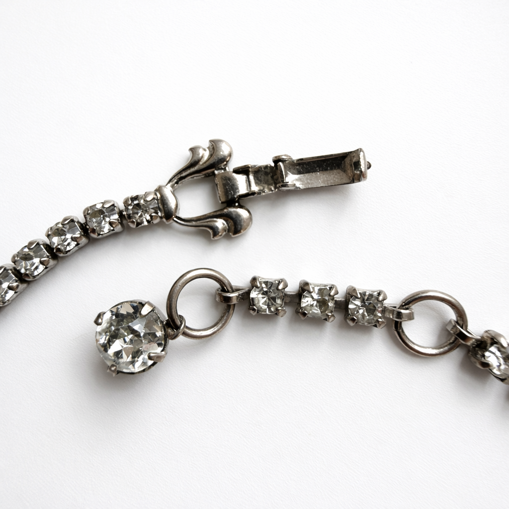 Stones are bright, present and claw set There is slight and visible age-related wear and darkening on some metal components, especially near the clasp/signature area; overall presentation remains strong.