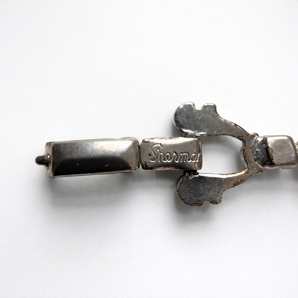 Signed Sherman necklace with Silver Tone Metal and Rhinestones. A refined one-of-one vintage find with Bib necklace styling, best suited for evening wear.