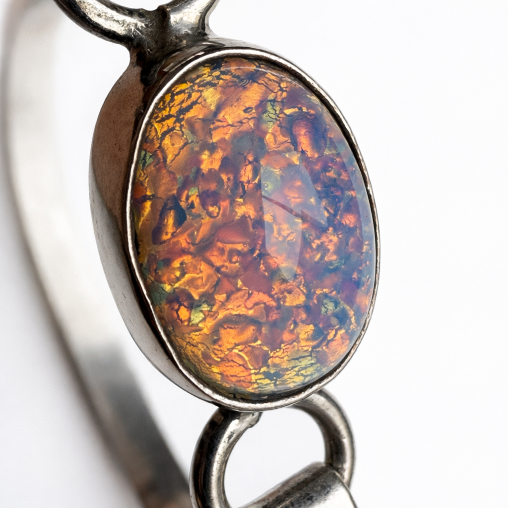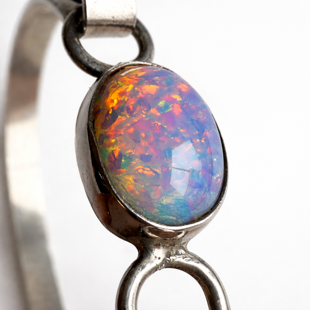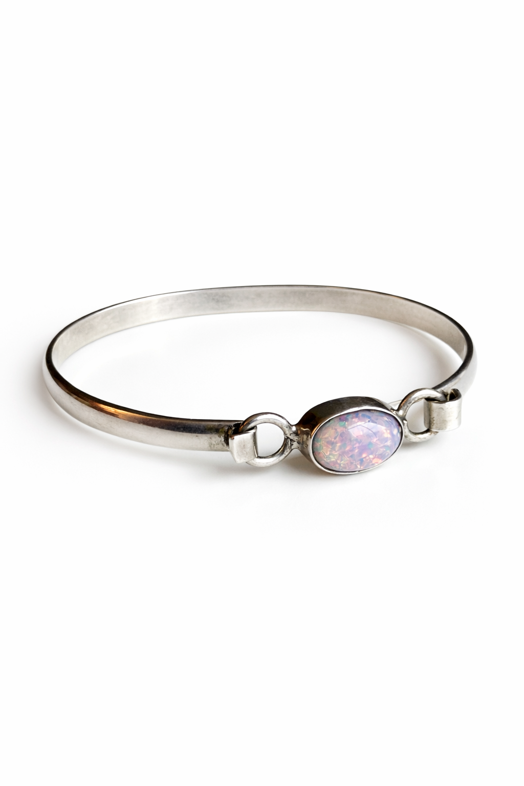 Sterling silver bangle centered with an oval iridescent opal-style cabochon. Clean, understated lines with soft color play and an elegant vintage feel.