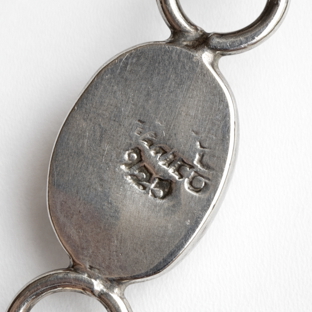 Light surface scratching and age-related wear to the silver in areas. Stone is bezel set, clean and secure, a beautiful stone with an overall mauve-pink cast. It fits just right on my 7-inch wrist. The bracelet weighs 17g.