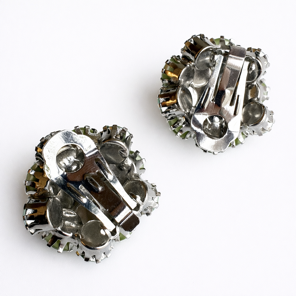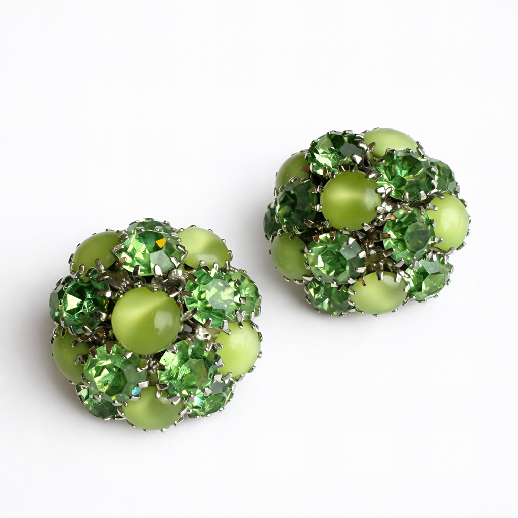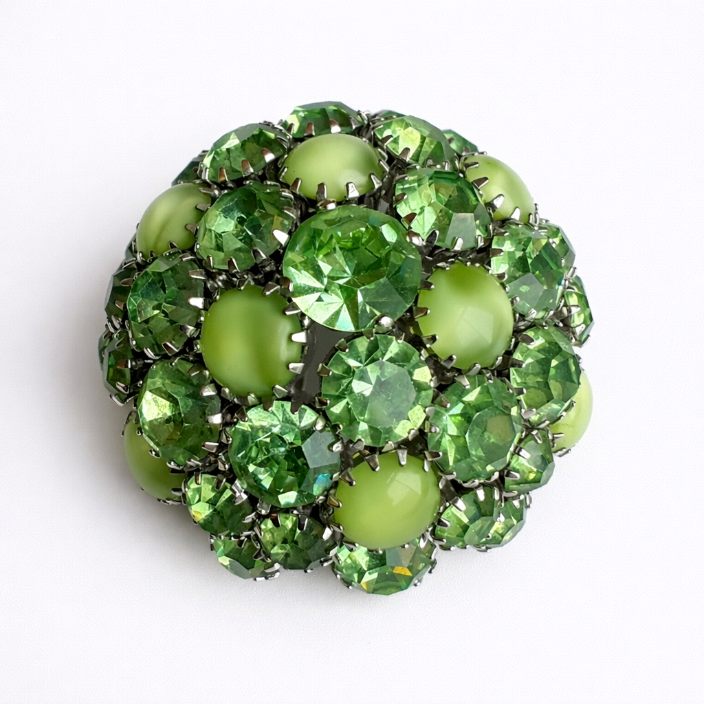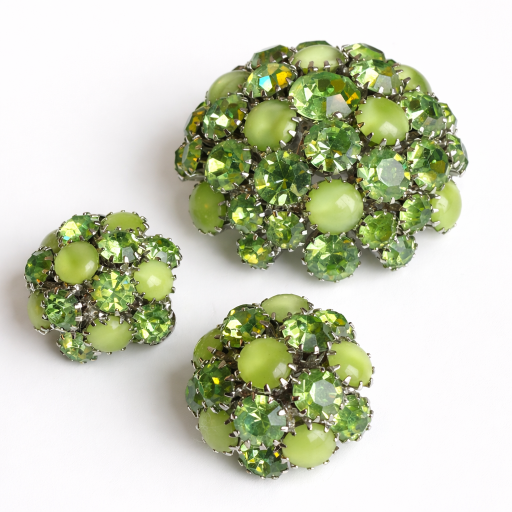 Signed Warner set featuring a domed brooch with matching clip-on earrings in layered light and medium green sparkling and opaque stones. A vibrant, dimensional mid-century look with strong collector appeal.