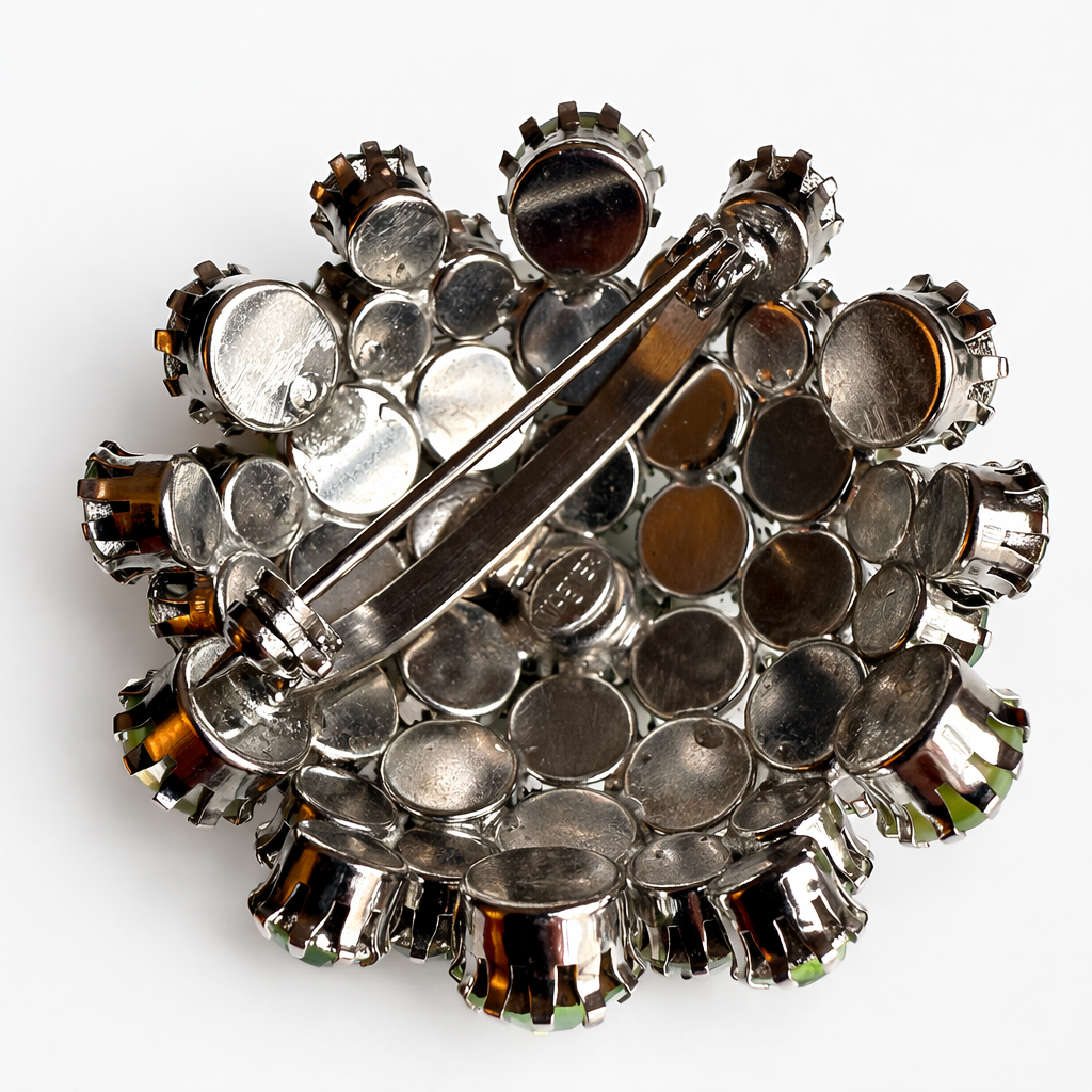 No missing stones. Light surface wear and minor age-related finish wear visible to the backs and findings; overall presentation remains strong. The brooch is clearly marked Warner, the identical matching earrings are unmarked. The brooch measures 2" x 2" and the dome is about .75 inches high. The earrings are 1 x 1" and .5 inches high.